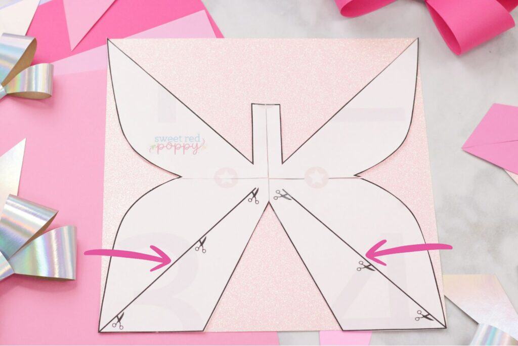 Next, cut out the bow template and cut along the diagonal cut lines that are on the bow. You can fasten the template to the cardstock with a small piece of tape or a paper clip.
