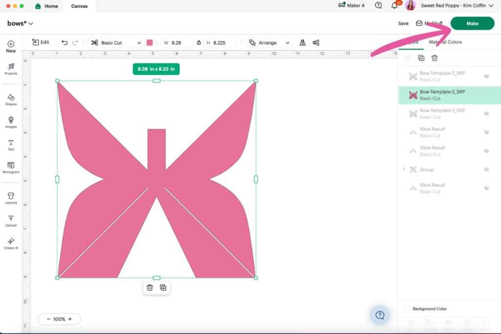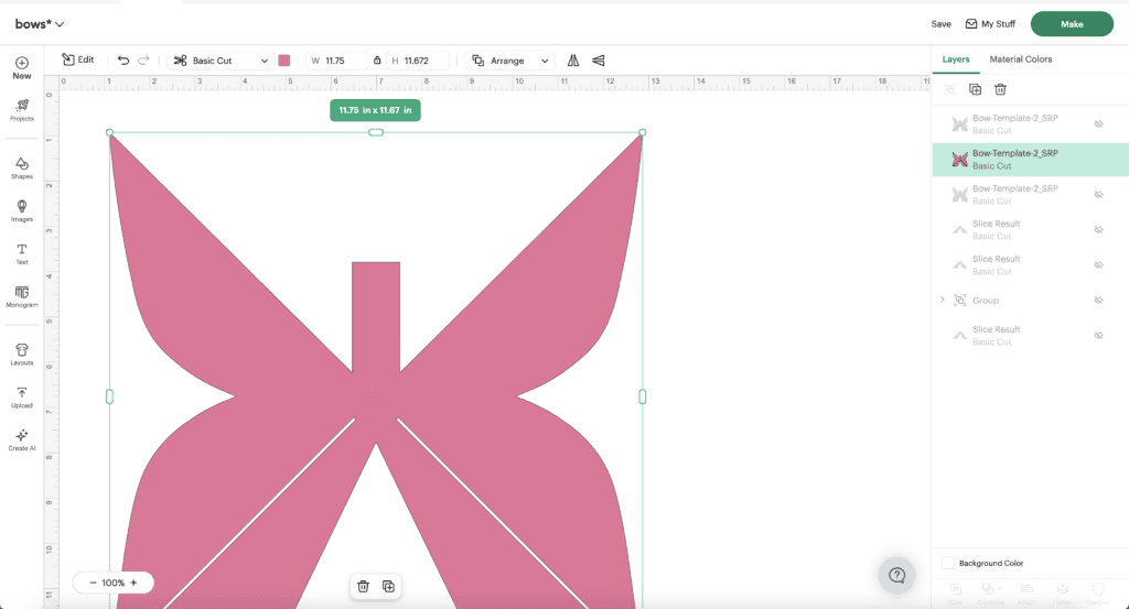 Once you're happy with the size click "Make" in the top right corner of the screen, load your material into your machine, select your material, follow Cricut's prompts, and cut out the bow template.