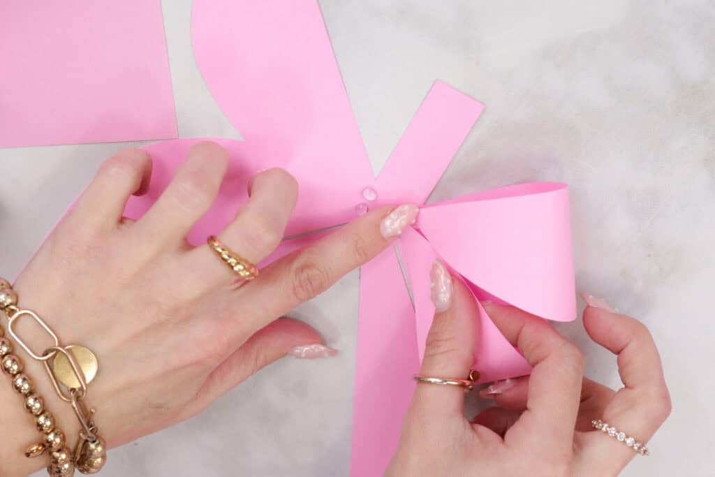 Bend one of the side pieces of the bow inward toward the center, adhering it to a glue dot.
