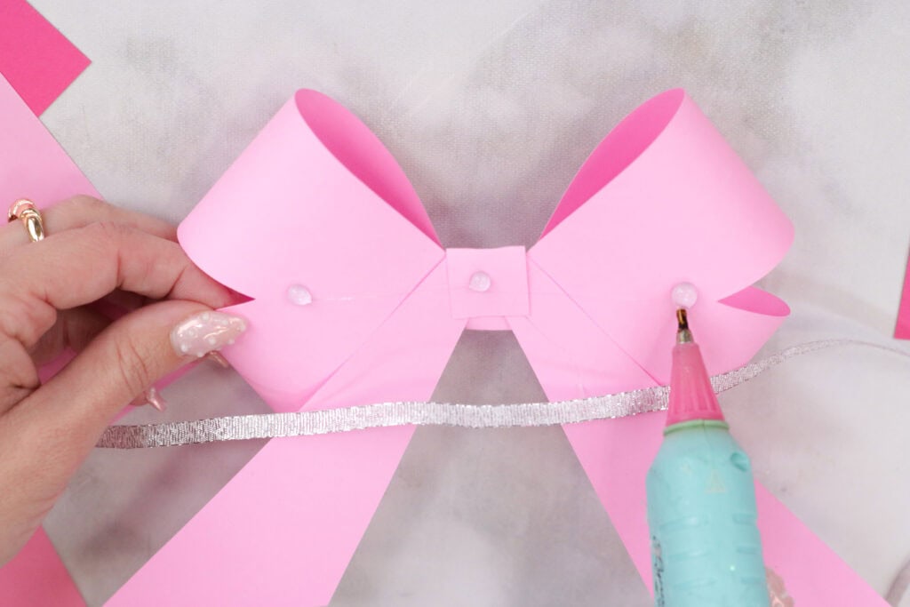 With a hot glue gun, add 4 dots of glue just below the center piece of the bow.