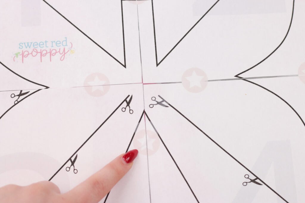Cut along the margins and line up the pink stars as you tape the template together with the pages in order. The pages are numbered 1-4 and should be laid out in a 2x2 grid.