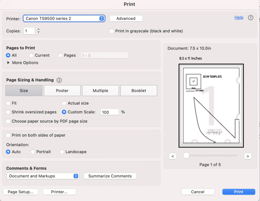 In the print settings dialog box, set the "Custom Scale" to 100% or select "Actual Size." Doing this will ensure the 1" test square measures exactly one inch when printed and the template is up to scale.